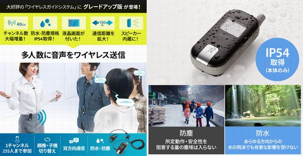 最大150m通信・同時5台発言対応、IP54防水防塵・抗菌仕様。